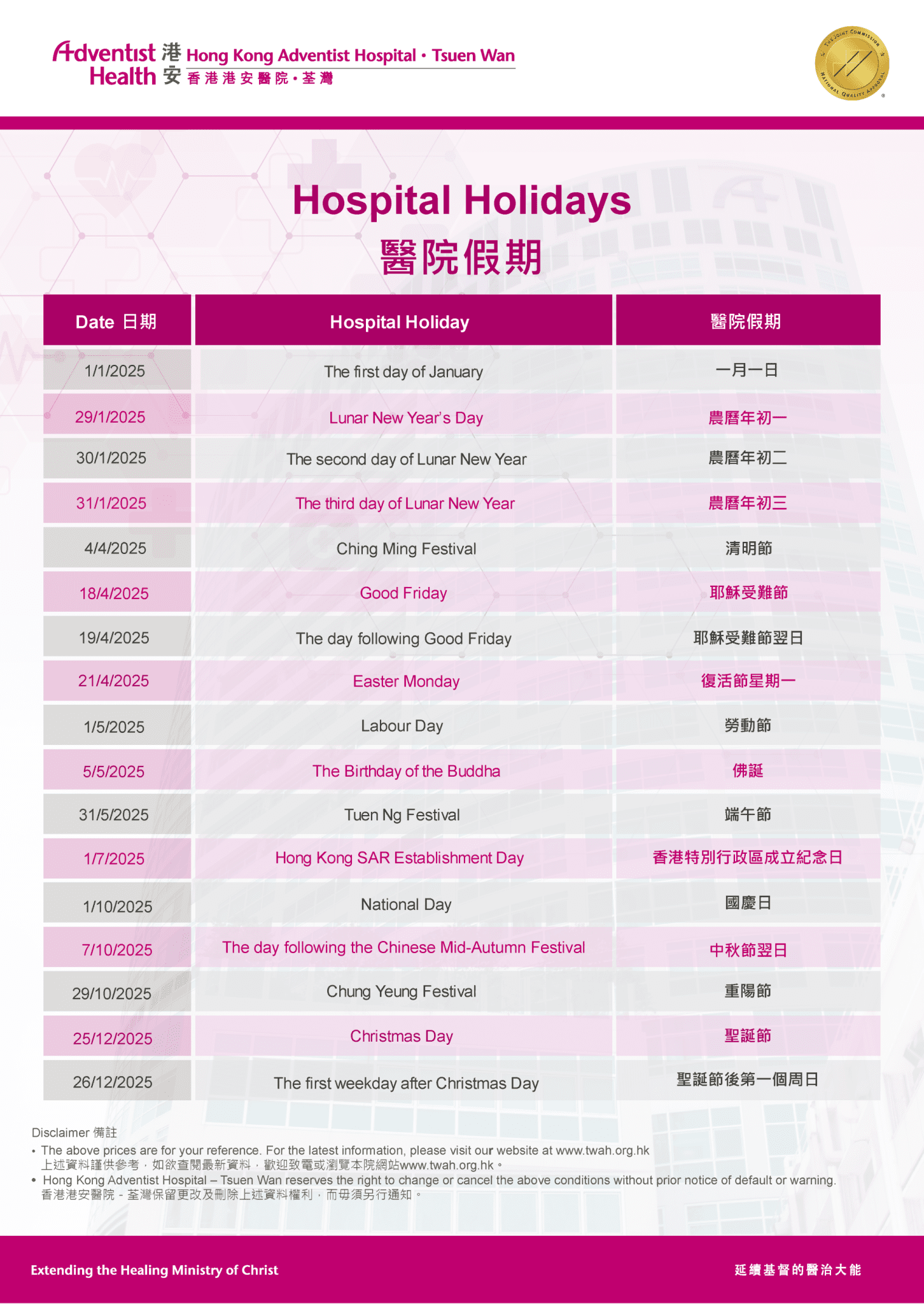 Hong Kong Adventist Hospital - Tsuen Wan is dedicated to providing comprehensive care and outpatient services and 24-hour emergency services year-round to patients in need.